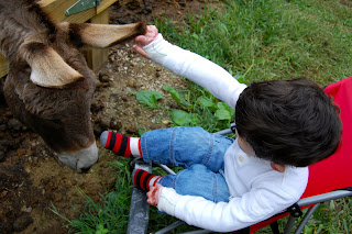 Today we went to check out the farm where we will be having Raul's birthday part next month! They have pony rides, a petting area with goats/bunnies/chickens, llamas/cows/donkeys/horses to look at, and a party room above their barn. Raul wasn't feeling too well today, so he didn't want to do a pony ride, but he pet some animals, and really liked visiting with the other animals and watching two older girls ride in the ring. He spent a while with the donkeys petting them and sticking his feet out to them. And he did his sign of "nice to meet you" to a few animals, and always waved goodbye to them :)